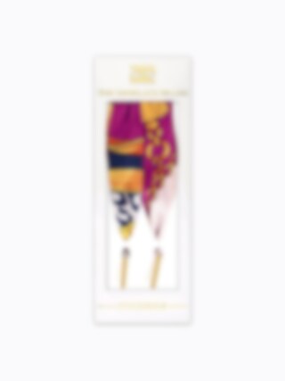 Lila flerfärgat skoband Scarf Laces från The Shoelace Brand med mönster av kedjor. Piffa upp dina skor med ett par snygga skoband i fint siden. 3 cm breda och ger en snygg, stor rosett. Guldfärgade ändar i metall med ingraverat "Stockholm" på. Levereras i en snygg ask med logotyp.