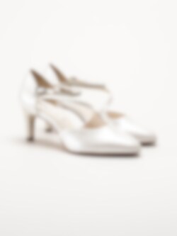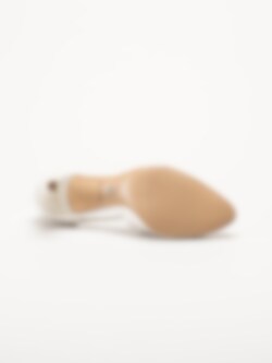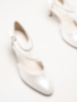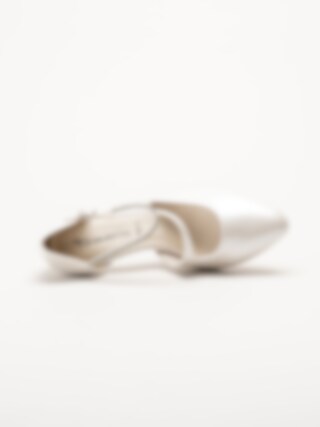 Vita pumps med sleif från Tamaris i färgen Pearl. Stilfulla och feminina pumps tillverkade i syntet som ger en elegant och sofistikerad look, perfekt för fest, bröllop och andra uppklädda tillfällen. Den spetsiga tån kompletteras av en dekorativ sleif med strass och ett litet spänne som kan knäppas, vilket ger både stil och en säker passform.